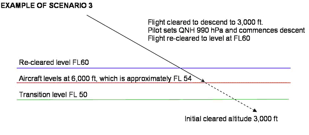 • Scenario 3. The flight is cleared to descend from above the transition level to an altitude that is below it. The pilot sets QNH and commences the descent. The ATCO re-clears the flight to a flight level above the transition level. The pilot levels at the re-cleared level but with QNH still set.