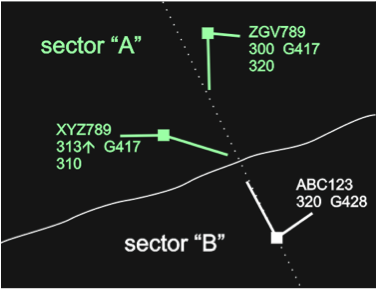- ZGV789 is flying on a direct route without prior coordination with sector “B” and the entry FL is ambiguous. It could be 300 (same as the current FL) in case the controller from sector “A” has spotted the conflict with ABC123. It is also possible that the controller from sector “A” has not spotted the conflict with ABC123 and is about to issue a climb clearance to ZGV789 (so that ZGV789 reaches the estimated FL320 before the boundary).