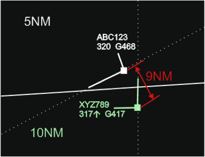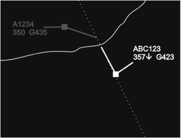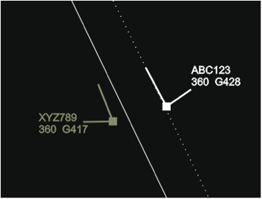 Example 3: Aircraft flying along the sector boundary, XYZ789 begins a turn to the right and converges with ABC123. The track label presentation of XYZ789 is such that the aircraft does not draw controllers’ attention (e.g. use of gray colour to display flights controlled by other sectors).