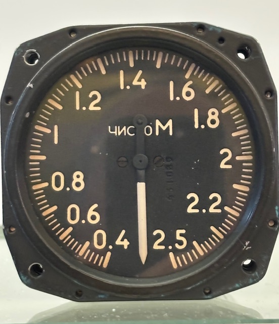 Machmeter from a Soviet-designed MiG-21. SKYbrary photo by Thomas Young, taken at the U.S. National Air and Space Museum's Steven F. Udvar-Hazy Center.