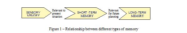 There are several ways to classify memory, based on duration, nature, and retrieval of information. Before information can be processed by the memory, it is received into the Sensory Memory where it remains for a brief period of time before being discarded or stored in the Short-Term Memory. After use, information contained in the short-term memory is lost unless it is stored in the Long-Term Memory. This simplified model is illustrated in Figure 1.