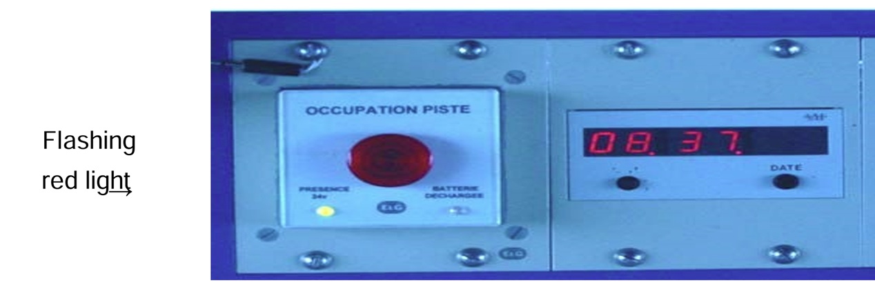 • Runway Occupied Boxes. Runway occupied boxes are a tool to remind a controller that the runway is occupied by a vehicle. It requires manual input by the controller. The controller places the box on the flight strip board during occasions when a vehicle is authorised to enter the runway. These types of devices normally have a flashing red light to remind the controller that the runway is occupied. An example of this memory aid is shown in the picture below.