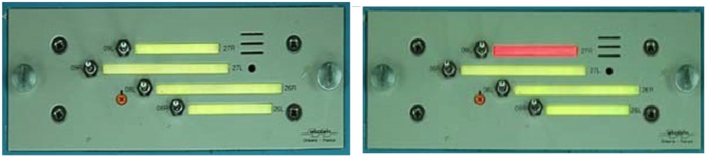 • Runway Occupancy Plate. The Runway Occupancy Plate (ROP) is manually activated and de-activated by the controller and provides a reminder for the controller that a runway is obstructed or closed. The runway occupancy plate is built to physically represent the runway configuration. When the controller switches on the ROP, in addition to a flashing red light, which acts as a memory aid that the runway is obstructed, the wind information is suppressed from the meteorological displays. It is a requirement when giving a take-off or landing clearance to transmit the actual surface wind. If the wind information is not available this will act as a further reminder that the runway is occupied. The wind information remains unavailable until the runway occupancy plate is switched off by the controller. An example of this memory aid is shown in the pictures below. On the left, all runways are available (depicted by green lights). On the right, one runway (27R) is occupied or closed (depicted by a red light).