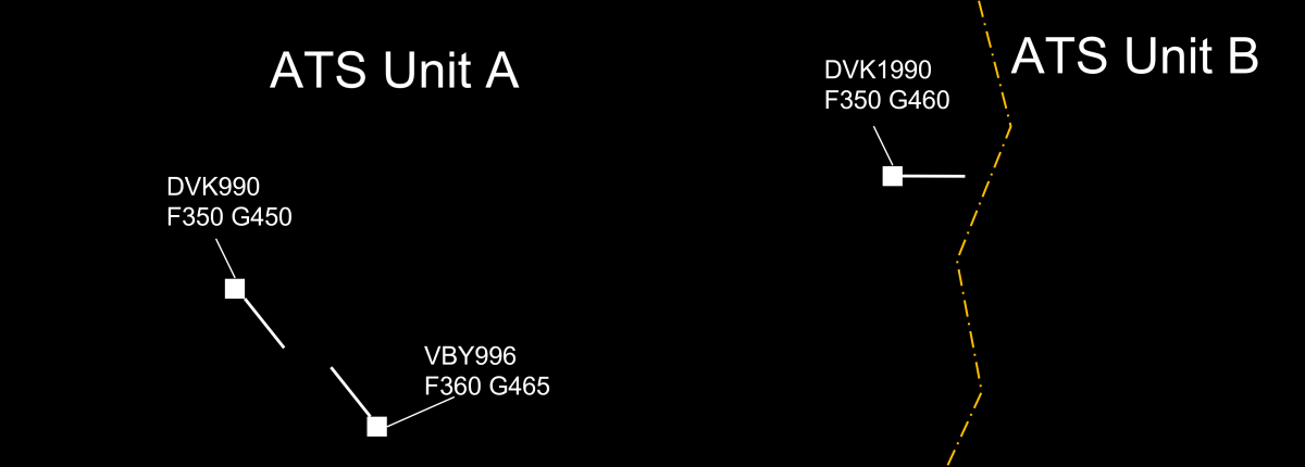 - DVK990 is in the airspace of ATS Unit A but on the frequency of ATS Unit B
