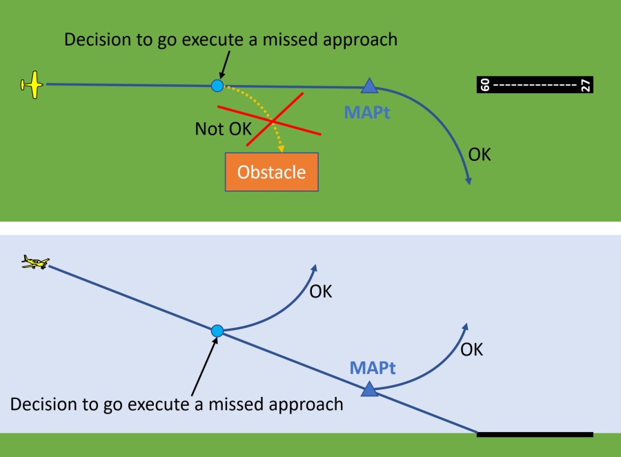 The climb portion must be initiated at or above the MDA/H and, depending on the circumstances, may start before the MAPt. The horizontal manoeuvre (the turn) however, is handled differently. If the decision to go around is made prior to the defined missed approach point (MAPt), the aircraft must continue the lateral tracking of the approach being conducted and only initiate the turn after passing that point. Doing otherwise could result in insufficient terrain clearance or a CFIT. If the decision to execute a missed approach is made at the MAPt, the missed approach procedure (including the turn) is to be initiated immediately.