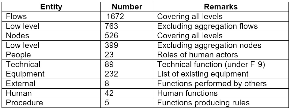 In terms of dimension there is a maximum of seven levels of decomposition of a function. Each node has as properties: Name, Parent, Unit, Extras and Type (optional); each flow is described by: Name, Parent, Origin, Control, Destination, Enabler, Extras and Unit (optional). The following table provides information MARIA’s current dimension.