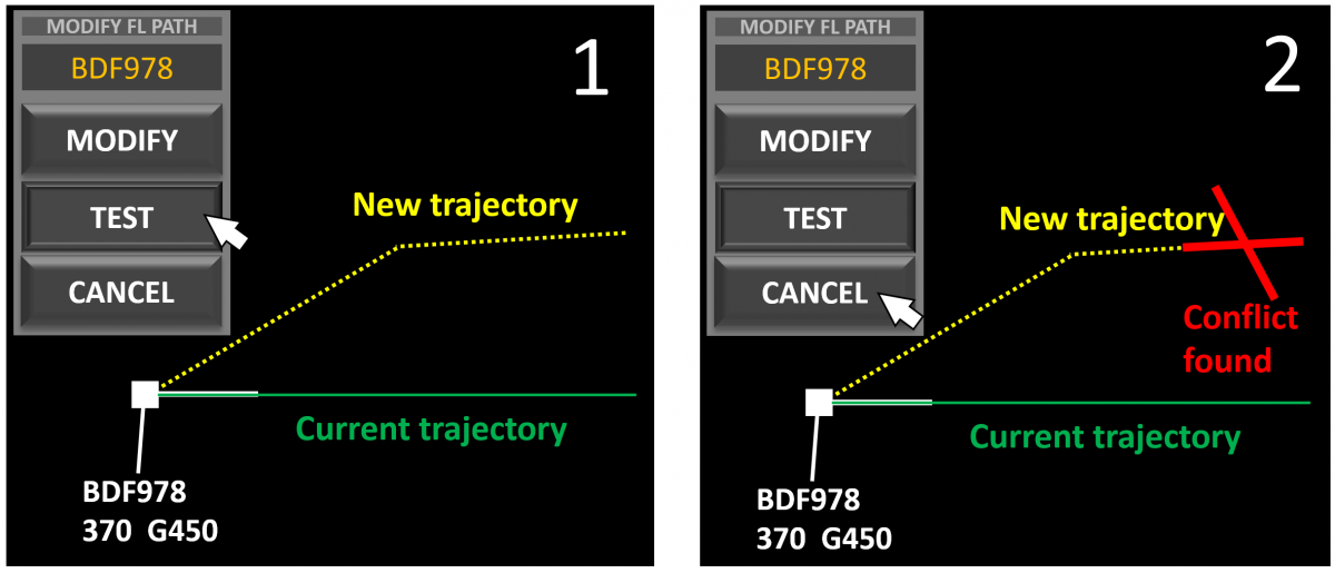 Picture 1 - The controller modifies the trajectory and sends the result to the Probe function. Picture 2 - The Probe function has found a potential conflict, the controller is about to cancel the modification.