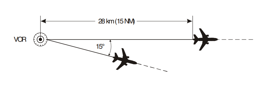 Example of lateral separation using VOR. Both aircraft are established on radials diverging by at least 15 degrees and at least one aircraft is at a distance of 15 NM or more from the facility