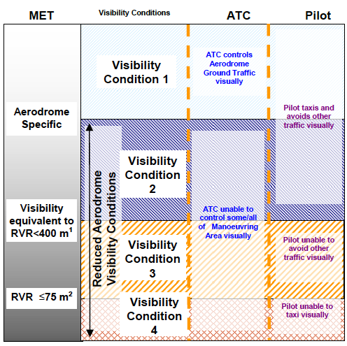The transition from Visibility Condition 2 to Visibility Condition 3 will be determined locally depending on factors such as the layout and complexity of the taxiway system, the types of aircraft operating. For taxiing this is normally taken as visibilities equivalent to an RVR of less than 400m (Doc 9476).