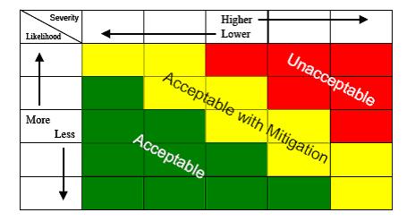 - Unacceptable (Red). Where combinations of severity and likelihood cause risk to fall into the red area, the risk would be assessed as unacceptable and further work would be required to design an intervention to eliminate that associated hazard or to control the factors that lead to higher risk likelihood or severity.