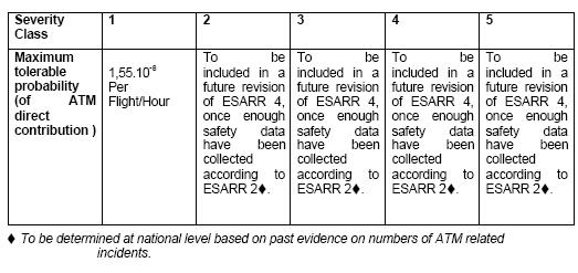 The table below has been extracted from EUROCONTROL ESARR4 - Risk Assessment and Mitigation in ATM. It associates the severity class (determined using a severity classification scheme) with a tolerable probability (i.e., a maximum tolerable probability of ATM directly contributing to safety occurrences) to show that the more severe the effect of the hazard the less desirable it is that the hazard occurs.