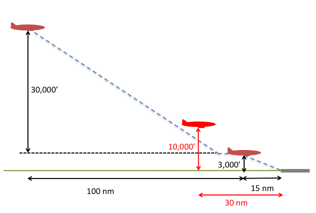 30,000’ cruise = (3 x 30) + 10 = 100 nm descent