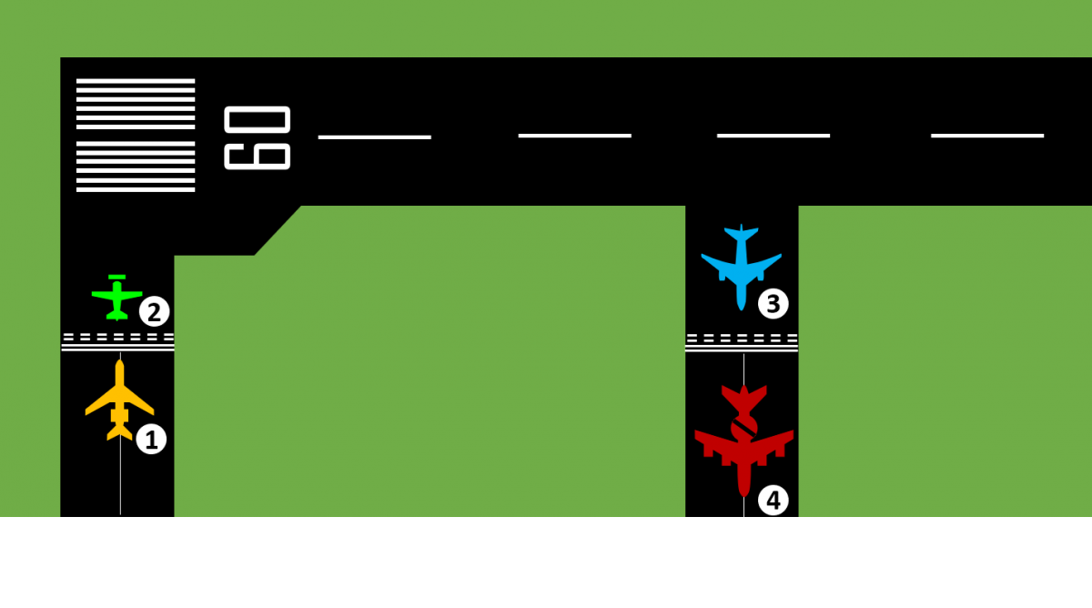 Examples of departing and arriving aircraft in relation to the holding position: (1) is at the holding position, (2) has passed the holding position, (3) is about to vacate and (4) has vacated the runway. Aircraft (2) and (3) are considered to be occupying the runway, i.e. that no other aircraft will receive a take off or a landing clearance at this moment.