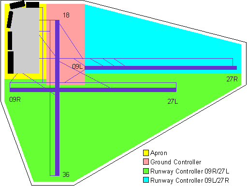 The implementation plan was well prepared. It included a commitment from management and gained the acceptance of Sometown Airport. The ATC Tower cap was rebuilt for the introduction of a new ground position and the controllers were trained in handling the new concept. The new ground position would handle the traffic, typically taxiing from crossing runway 18/36 and east of the runway, e.g. for departure runway 09L or 27L, after landing runway 09R or 27R until they had crossed runway 18/36 (fig. 2).