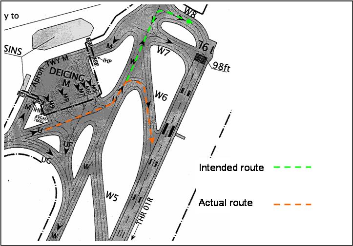 Typically the pilots were taxiing eastbound on taxiway Uniform for departure southbound on runway 19L. Instead of lining up at the runway end, they used intersection W6. Although the stop bar was switched off at the runway end, it was still lit at the intersection. (See diagram below).