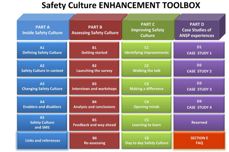 The Safety Culture Enhancement Toolbox provides information and practical advice to help ANSPs understand, assess and enhance Safety Culture within their organisation. Its main aim is to answer the following frequently asked questions: