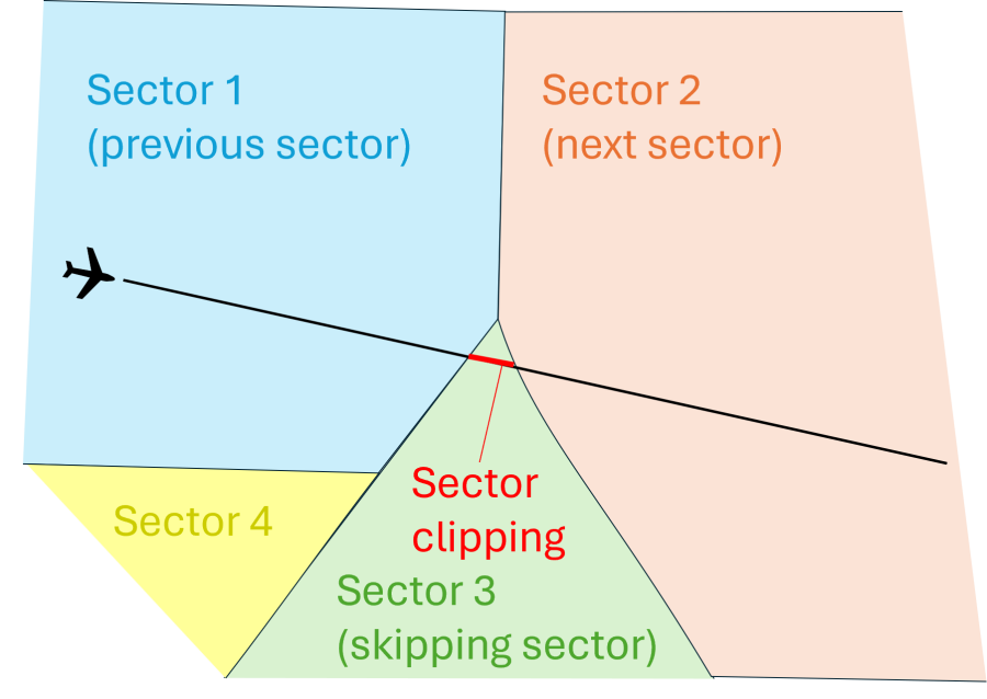 Sometimes situations occur where a flight passes through an ATS sector for a very short time (a few seconds up to a few minutes). This is called sector clipping. Sector skipping is a procedure that allows a sector that is part of a flight's sector sequence to opt out of that sequence. Thus, communication with the flight crew is transferred directly from the previous to the next sector.