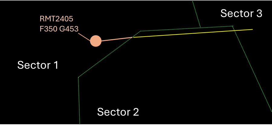 Longer clipping close to the boundary. In this situation, the aircraft will fly in the skipping sector for several minutes. However, as this happens along the inter-sector boundary, the controllers may decide that no benefit would come from transferring the aircraft.