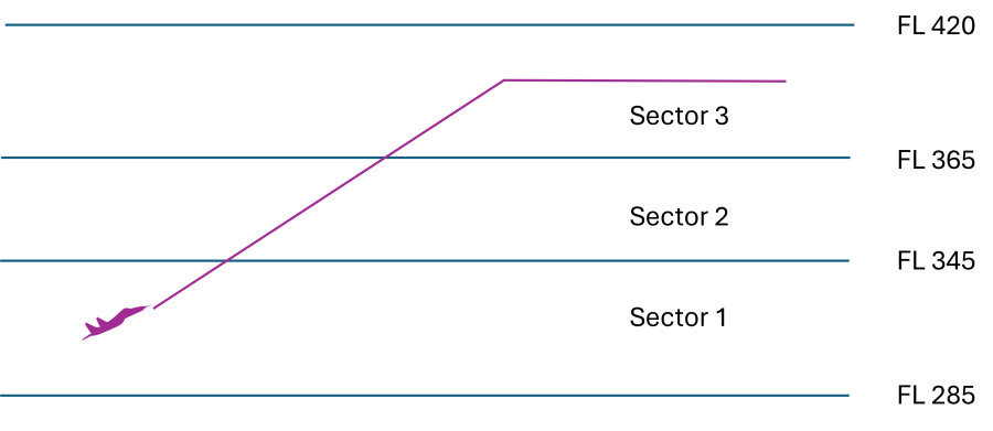 The cruising level is FL 390. This means that the flight will likely pass through Sector 2 for a short period of time, climbing to FL 350 while entering the sector and to FL 370 while leaving it.