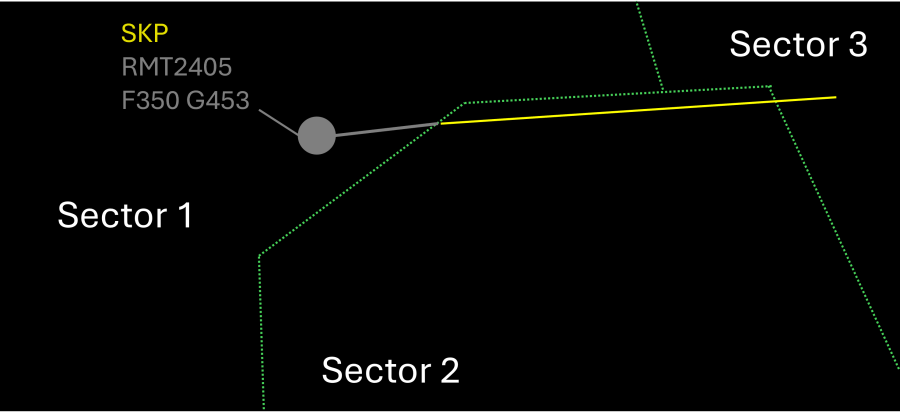In the example above, the flight is skipped and therefore the track label is presented in unconcerned colour to the skipping sector. However, to indicate that the aircraft might be of interest, yellow string "SKP" is displayed above the label. Clicking on that label would allow the controller to undo the skip.