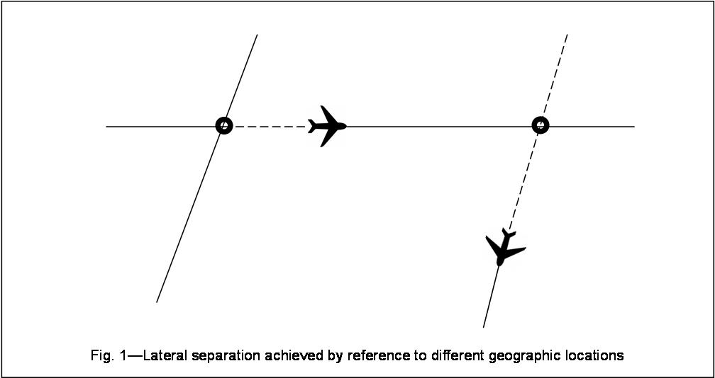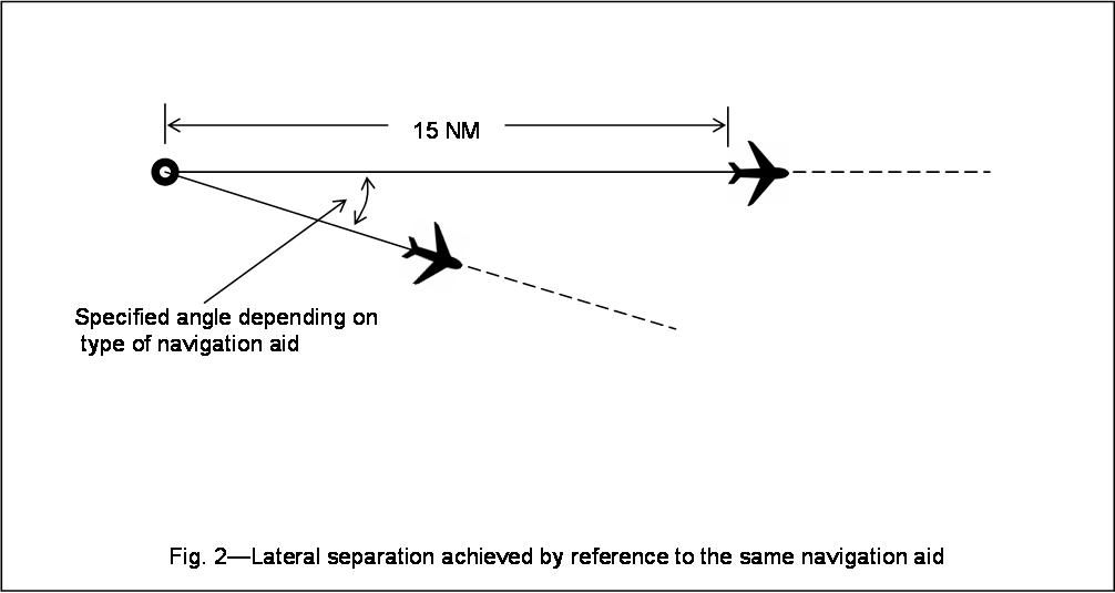 - By requiring aircraft to fly on specified tracks which are separated by a minimum angle. Both aircraft must be established on radials or tracks which diverge by a specified amount depending on the type of navigation aid in use, and at least one aircraft must be at a distance of 15 NM or more from the facility (see Fig. 2).