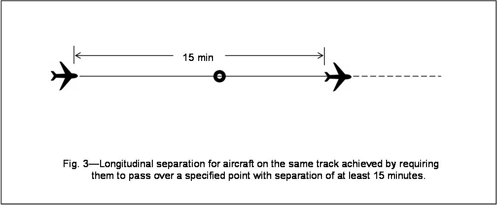 Longitudinal separation is applied so that the spacing between aircraft is never less than a specified amount. For aircraft following the same or diverging tracks, longitudinal separation may be achieved by requiring aircraft to make position reports and comparing the time of their reports (see Fig. 3) and by speed control, ensuring that the speed of the following aircraft does not exceed the speed of the leading aircraft. Reduced separation may apply if the leading aircraft is maintaining a higher speed than the following aircraft.