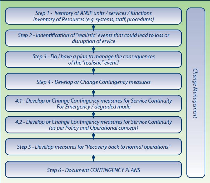 - For further information on Contingency Planning see the EUROCONTROL, Guidelines for Contingency Planning for Air Navigation Services (including Service Continuity). There is extensive material on service continuity in Chapter 8 of the Second Edition, page 60. Page 44 deals with continuity in the context of ‘Concept of operations’. Appendix H provides further details about the economic assessment of business continuity investments, page 136.