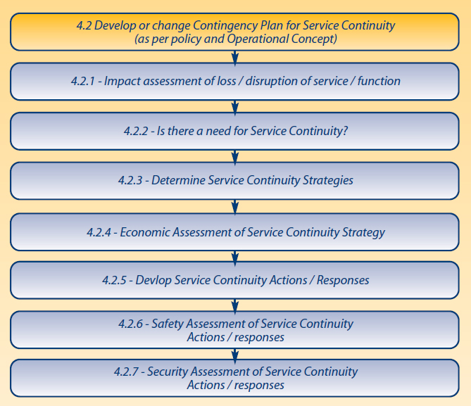 This shows how initial inventories and risk assessments inform the decision to invest in service continuity. It also shows how service continuity ultimately leads into recovery operations for the return to normal service.