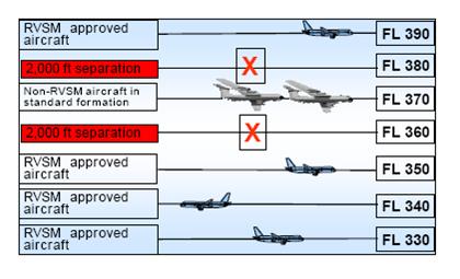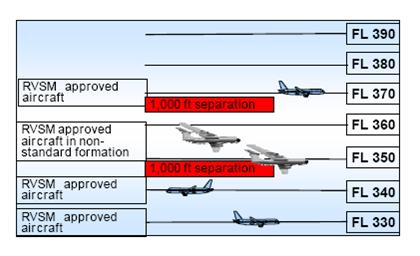 With the implementation of domestic RVSM (DRVSM) within the U.S. National Airspace System, the FAA and Department of Defence (DoD) provided recommendations for improvements and changes to RVSM separation minima procedures. The recommendation to provide RVSM separation to formation flights including only RVSM compliant aircraft was accepted by FAA with Notice 7110.406 during May 2005. FAA argues that providing RVSM separation to formation flights comprised completely of RVSM compliant aircraft contributes to more efficient use of airspace and reduces the impact on air traffic controllers. (See Figure 2)