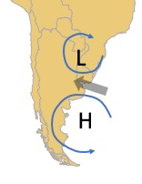 A sudestada with rain is generated by the combined effect of two systems: a high pressure system located on the Atlantic Ocean off the coast of central Patagonia, which via is counterclockwise circulation brings cold sea air to the east of Buenos Aires Province and the south of the Argentine littoral and Uruguay, and a clockwise rotating low pressure system, located over the center-south of Argentine Mesopotamia and western Uruguay, that brings hot, humid air to the same region. As the pressure in the latter system drops, winds from the southeast increase accompanied by persistent rain and drizzle, low cloud and occasionally thunderstorms. As the depression moves east into the Atlantic Ocean, the winds turn to the south west and become drier. Sudestadas typically last one to three days.