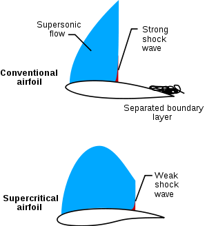 A supercritical aerofoil is an aerofoil that, principally, has been designed to delay the onset of wave drag in the transonic speed range. Typical features of supercritical aerofoils, when compared to traditional aerofoil shapes, are a flattened upper surface, a highly cambered or curved aft section and greater leading edge radius.