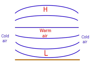 The blue lines indicate the isobaric surfaces, the L and H correspond to the resulting low and high pressure areas. For simplicity, the isobaric surfaces were only drawn in for the thermal low and not continue into the thermal high areas in the relative cold air.