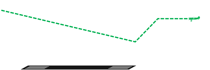 An example of the path of an aircraft, performing a go around. The flight descends to the minimum descent altitude (or decision altitude) and then starts to climb. Note that in a real-life situation the procedure may start before reaching the MDA/DA and sometimes after that.