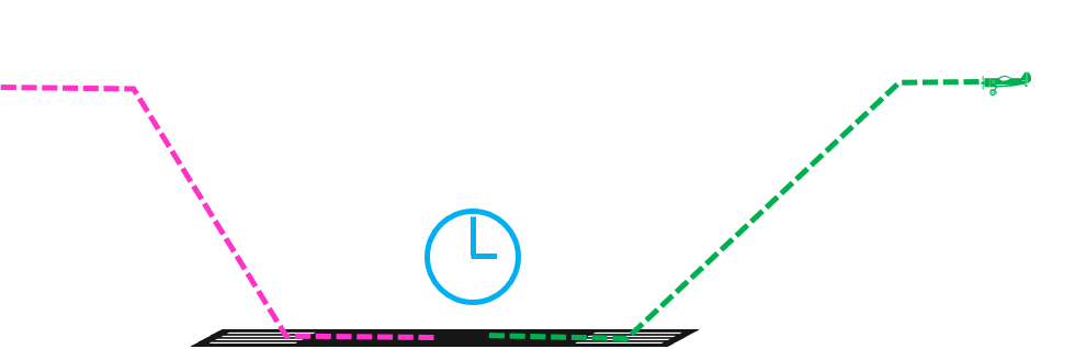 An example of the path of an aircraft, performing a stop and go. The green part is the landing, the blue clock indicates the time when the aircraft is stopped preparing for take-off and the pink part is the take off.