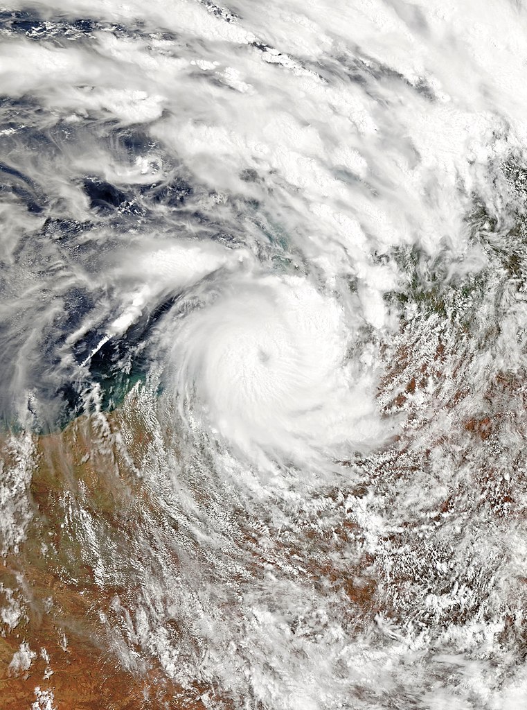 Although the underlying soil in Northern Australia is desert sand, some tropical cyclones have been observed to reintensify when they make landfall, often reacquiring classical inner-core structure, including eyes. Such redeveloped warm-core cyclones are commonplace in the remote desert areas of northern Australia, where they are called “agukabams” from the aboriginal word roots “agu,” meaning land, and “kabam,” meaning storm.