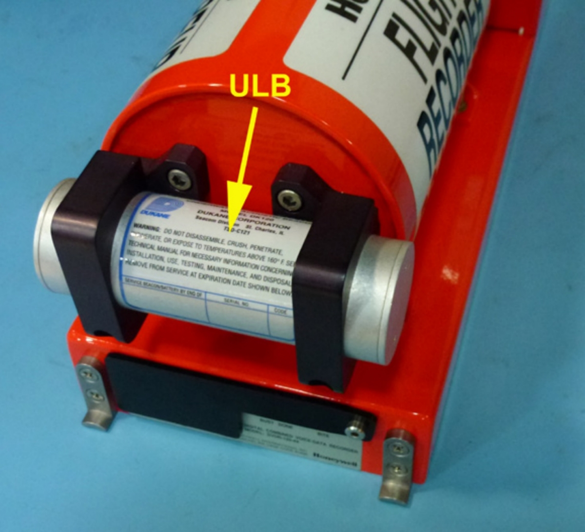 An underwater locator beacon (ULB), also called an underwater locating device (ULD) or underwater acoustic beacon is a device fitted to aviation flight recorders such as the cockpit voice recorder (CVR), the flight data recorder (FDR) as well as to the aircraft fuselage. Once activated by immersion in water, a ULB is designed to emit an ultrasonic pulse at 37.5 kHz every second for a duration of at least 30 days. ULBs attached to the airframe transmit at 8.8kHz and are called low frequency ULBs.