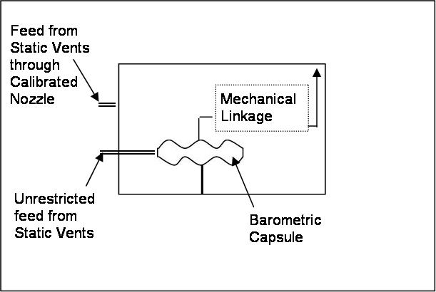 In a simple VSI, a barometric capsule is contained in a sealed case. The capsule is fed with static pressure from the pitot-static system, while the case is also connected to that system through a calibrated nozzle. The nozzle restricts the passage of air so that there is a time delay between a change in static pressure and that pressure being experienced within the case. Thus, if the aircraft climbs (or descends), the pressure within the capsule will decrease (increase) while that within the case will decrease (increase) at a lower rate due to the presence of the nozzle. Movement of the capsule is translated into movement of a needle by a mechanical system.