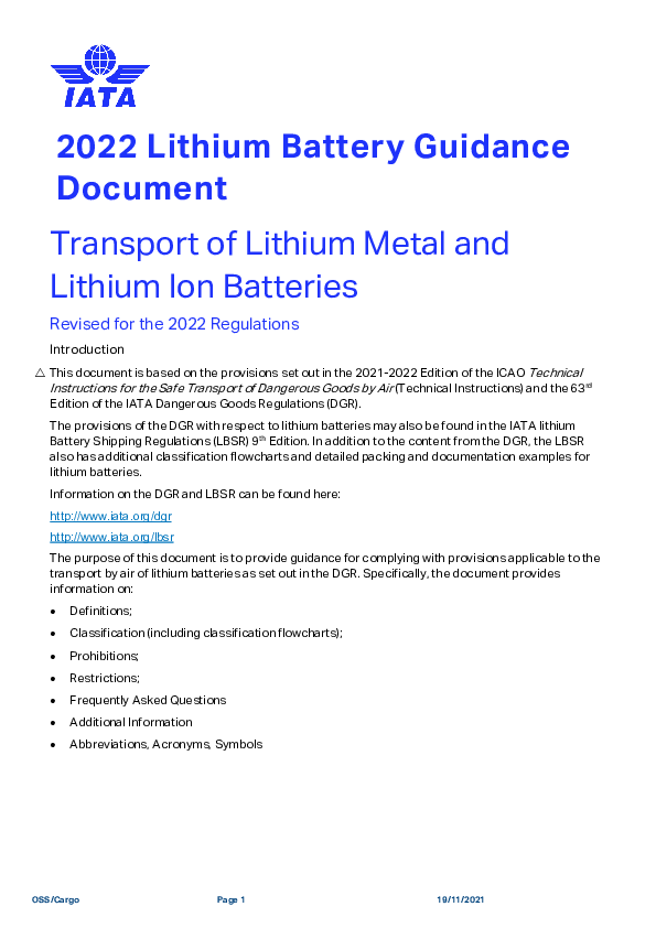 The purpose of this document is to provide guidance for complying with provisions applicable to the transport by air of lithium batteries as set out in the IATA Dangerous Goods Regulations.