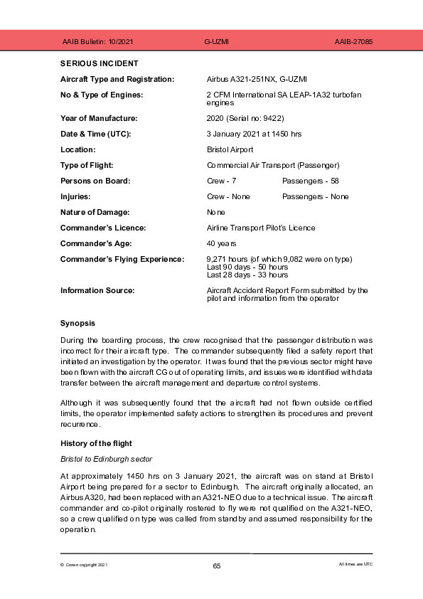 On 3 January 2020, an Airbus A321neo crew found that the boarded passengers were seated such that the flight could not operate within the allowable flight envelope. Necessary reseating followed with a safety report filed. An internal investigation with State Investigation Agency awareness found that a systemic company IT issue was enabling invalid outputs. When the same aircraft’s inbound flight from Bristol was checked, a similar but undetected error was found to have resulted in that flight having operated outside the allowable flight envelope. Pending a permanent fix for the computerised load control system, manual checking procedures were immediately implemented.