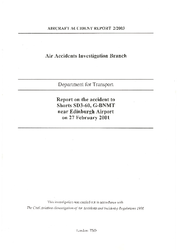 AAIB Aircraft Accident Report 2/2003 Shorts SD3-60, G-BNMT near Edinburgh 27 February 2001