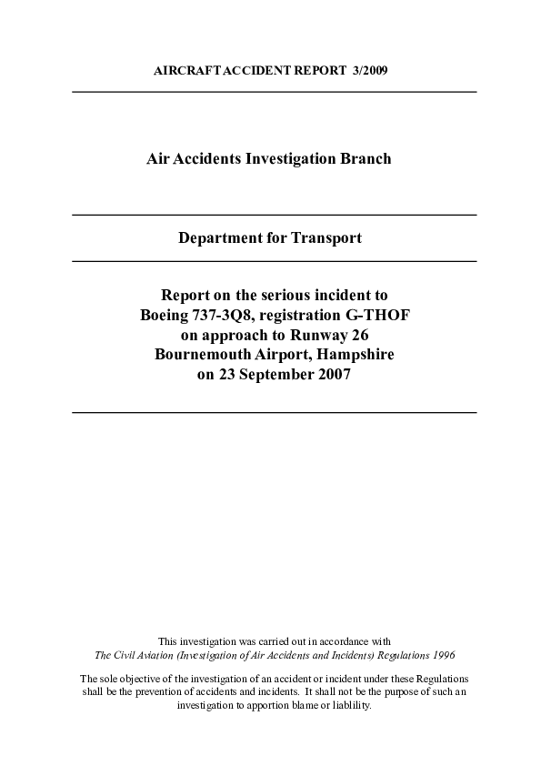 AAIB Aircraft Accident Report 3/2009, Serious Incident Boeing 737-3Q8, G-THOF, Bournemouth 23 Sep 20