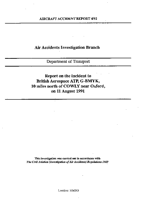 AAIB Aircraft Accident Report 4/92, British Aerospace ATP, G-BMYK, COWLY near Oxford, 11 August 19