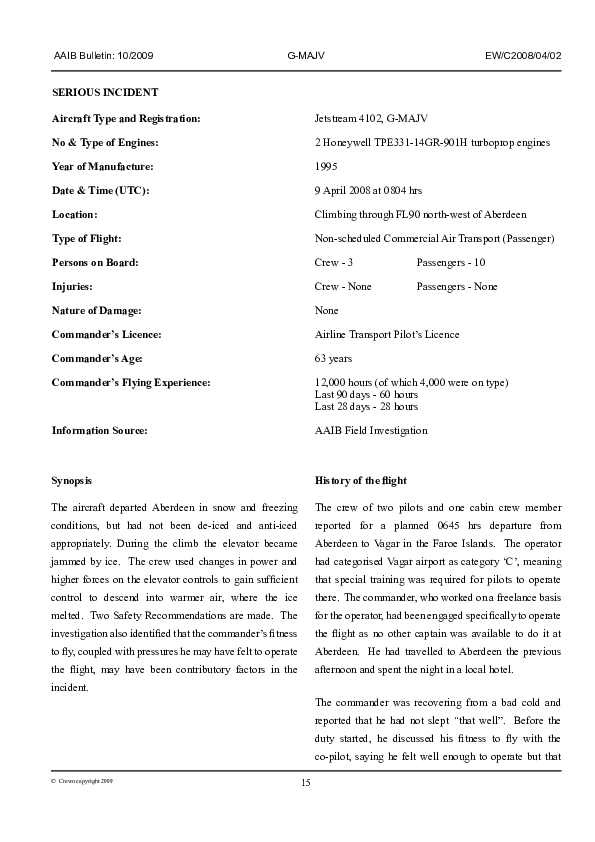 AAIB Bulletin 10/2009 - Jetstream 4102, G-MAJV, near Aberdeen UK, 9 Apr 2008