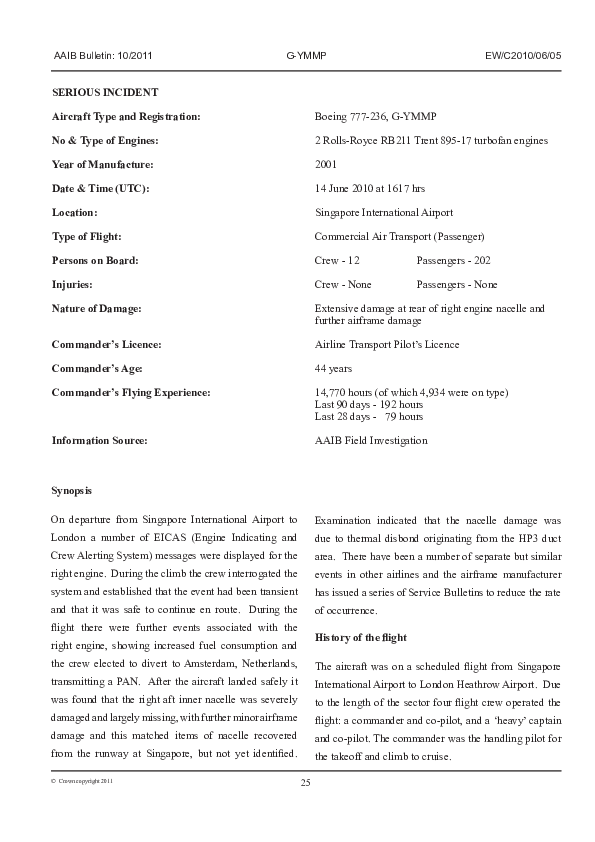 AAIB Bulletin 10/2011 EW/C2010/06/05, Boeing 777-236, G-YMMP, Singapore Int'l Airport, 14 Jun 2010
