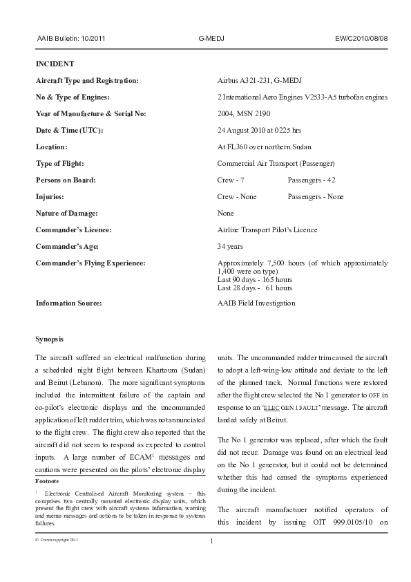 Electrical failure. On 24 August 2010, an Airbus A321-200 being operated by British Midland on a scheduled public transport service from Khartoum to Beirut experienced, during cruise at FL360 in night IMC, an electrical malfunction which was accompanied by intermittent loss of the display on both pilots’ EFIS and an uncommanded change to a left wing low attitude. De-selection of the No 1 generator and subsequent return of the rudder trim, which had not previously been intentionally moved, to neutral removed all abnormalities and the planned flight was completed without further event with no damage to the aircraft or injuries to the 49 occupants.