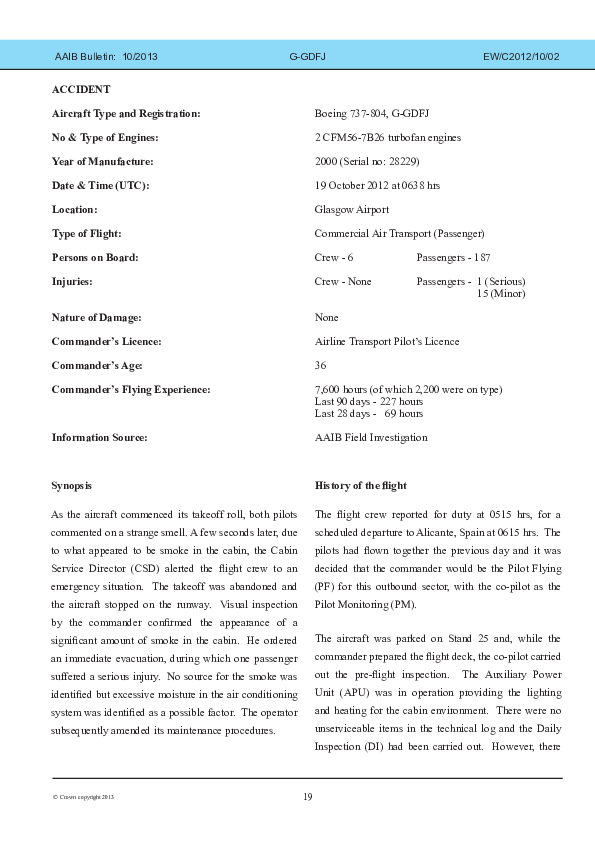 On 19 October 2012, a Jet2-operated Boeing 737-800 departing Glasgow made a high speed rejected take off when a strange smell became apparent in the flight deck and the senior cabin crew reported what appeared to be smoke in the cabin. The subsequent emergency evacuation resulted in one serious passenger injury. The Investigation was unable to conclusively identify a cause of the smoke and the also- detected burning smells but excess moisture in the air conditioning system was considered likely to have been a factor and the Operator subsequently made changes to its maintenance procedures.