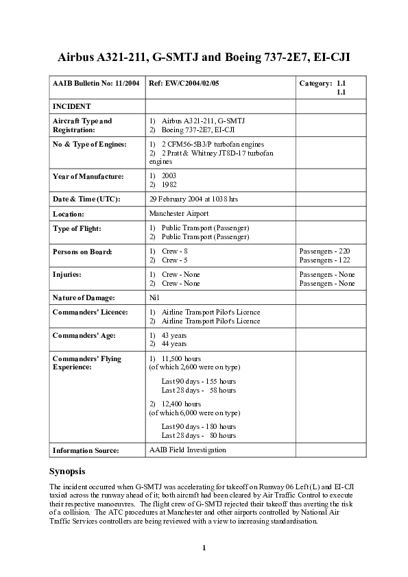 AAIB Bulletin 11/2004 EW/C2004/02/05, Boeing 737-2E7, EI-CJI / Airbus A321-211, GSMTJ, Mancheste