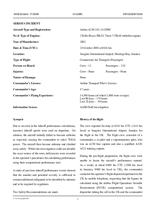 AAIB Bulletin 11/2009, Airbus A330-243, G-OJMC, Montego Bay, Jamaica, 28 Oct 2008