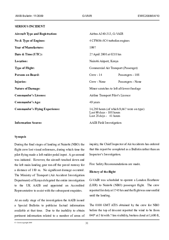 AAIB Bulletin 11/2009 EW/C2008/04/10, Airbus A340-313, G-VAIR, Nairobi Kenya, 27 Apr 2008