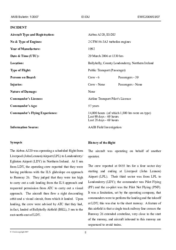 AAIB Bulletin 1/2007 EW/C2006/03/07, Airbus A320, EI-DIJ, Ballykelly, 29 Mar 2006